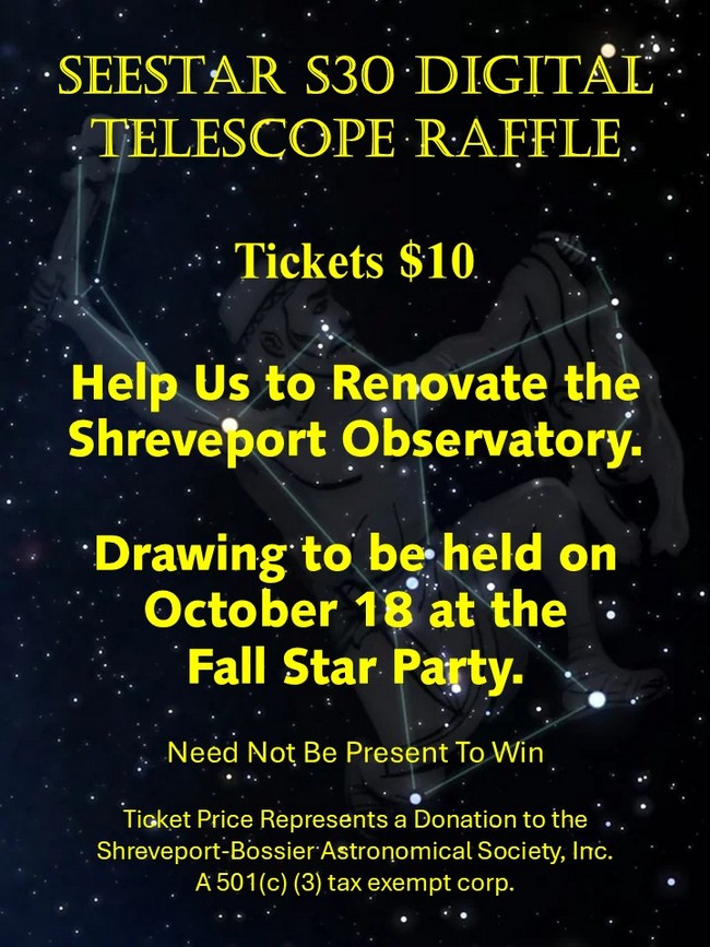 The Society began it's 66th year in operation in 2025. This year marks 60 years of Shreveport Observatory serving the public. The Society is continuing it's fund raising effort with the Observatory Golden Fund in order to renovate and improve the Observatory for another 60 years. We hope to provide improvments to the buildings, obtain new state-of-the-art equipment to enhance the public observing night experience, develop new educational programs, and help to maintain the Society's liability insurance. Funds will also help to support repairs to the Observatory suffered in recent storms.